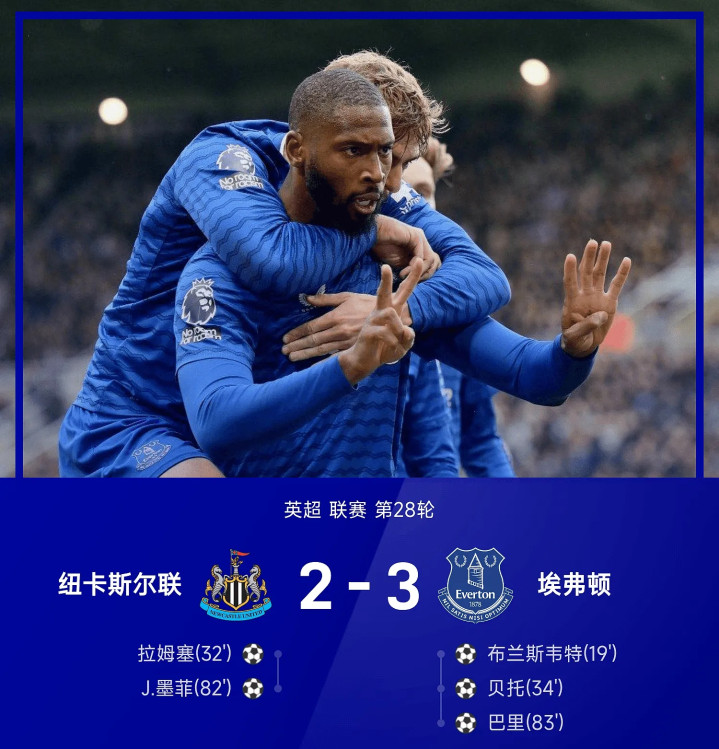 开场19分钟,反客为主!布兰斯韦特顶球顶入死角破门,埃弗顿1-0纽卡,第32分钟,托纳利助功 ,拉姆塞远射变线扳平,纽卡1-1埃弗顿,第34分钟,这波太离谱!波普脱手送大礼,贝托笑纳空门,埃弗顿2-1纽卡,第81分钟,乔林顿危险区域 左侧挑传中路,雅各布·墨菲凌空抽射,皮球有个小折射后飞进古代足球 门 ,纽卡斯尔联2-2埃弗顿。第83分钟,埃弗顿左路形成冲破 杀入危险区域 后横传门前,巴里在防卫 球员干扰下依旧把球撞进古代足球 门 ,埃弗顿3-2纽卡斯尔联。