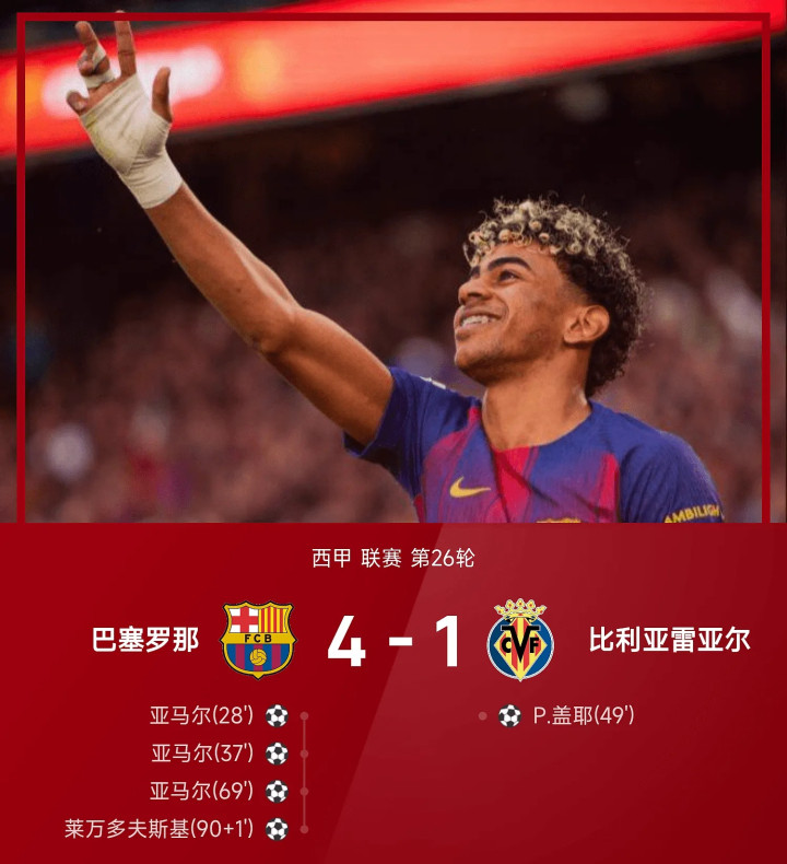 3月1日 25/26赛季西甲职业联赛 第26轮,巴塞罗那主场作战 对阵比利亚雷亚尔。本场赛事 亚马尔表现出色,连入三球上演独中三元,莱万后备 登场再入一球锁定胜局。盖耶破门难救主。最终全场赛事 结束,巴塞罗那4-1战胜比利亚雷亚尔。